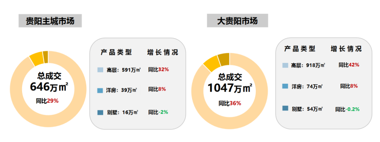 从成交结构来看,除别墅类产品受市场供应减少因素,均大幅上升。贵阳主城市场方面,总成交646万㎡,同比增长29%;其中,高层成交591万㎡,同比增长32%;洋房成交39万㎡,同比增长8%;别墅成交16万㎡,同比下降2%。大贵阳市场方面(包括贵安、清镇、双龙),总成交1047万㎡,同比增长36%;其中,高层成交918万㎡,同比增长42%;洋房成交74万㎡,同比增长8%;别墅成交54万㎡,同比下降0.2%。