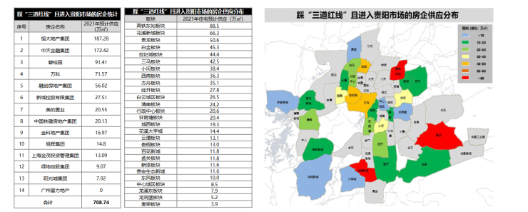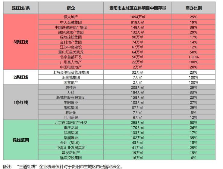 今年,在“房住不炒”的大前提下,监管部门于8月中旬,出台新规控制房地产企业有息债务的增长,设置“三道红线”。根据触线情况不同,试点房企分为“红(3 条)、橙(2条)、黄(1条)、绿(0)”四挡,以有息负债规模为融资管理操作目标,分档设定为有息负债规模增速阈值,每降低一档,上限增加5%。目前,贵阳踩“三道红线”的房企共计21家,其中11家触碰了“3条红线”,该部分房企对资金流回正尤为重视。