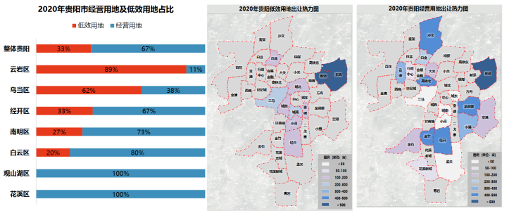 类型方面,2020年,贵阳共计成交50宗经营性用地,占总成交59%,总成交面积870万㎡,平均楼面价2804元/㎡;共计成交34宗低效用地,占总成交41%,总成交面积611万㎡,平均楼面价4150元/㎡。