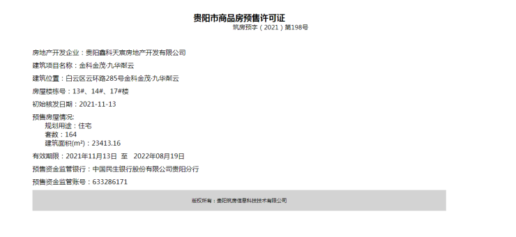 上周贵阳共颁出2张预售证,准销许面积共计52049.64平方米,共384套房源,获预售项目分别为金科金茂·九华粼云、南湖·丽水铭城·湖语半岛商住楼项目。