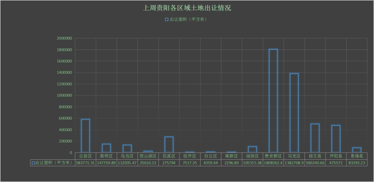 其中,贵安新区出让面积最多,为1808362.48方米;其次为双龙区,出让面积1382708.9平方米;此外为云岩区,出让面积583771.31平方米;