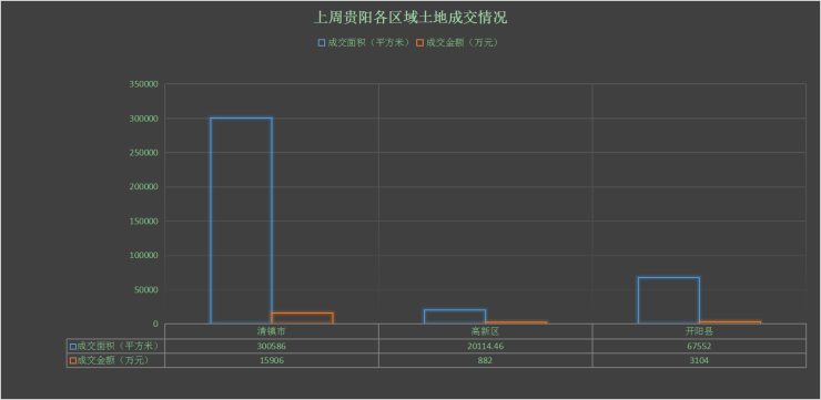上周成交区域分别为清镇市、高新区、开阳县。其中,清镇市成交面积最多,为300586平方米,且成交金额最高,为15906万元。