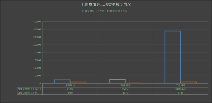 成交方面,上周贵阳共成功交易12宗地块,成交面积388252.46平方米,环比下降41.6%;成交金额19892万元,环比下降84.2%;