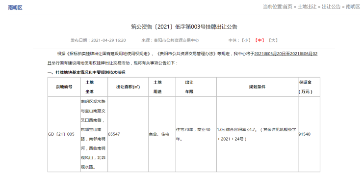 最高起价8030元/㎡!南明区新推出约33.7万方低效用地 近日,据贵阳市公共资源交易中心公示,南明区挂牌出让3宗低效用地,出让面积为336954平方米。 据悉,GD(21)005号地块为南明…… 所属分类:房产资讯 2021年4月30日