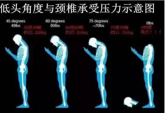 一个人的头部重量约5kg,当前倾看手机时,颈部肌肉就要承受25千克以上的重量。