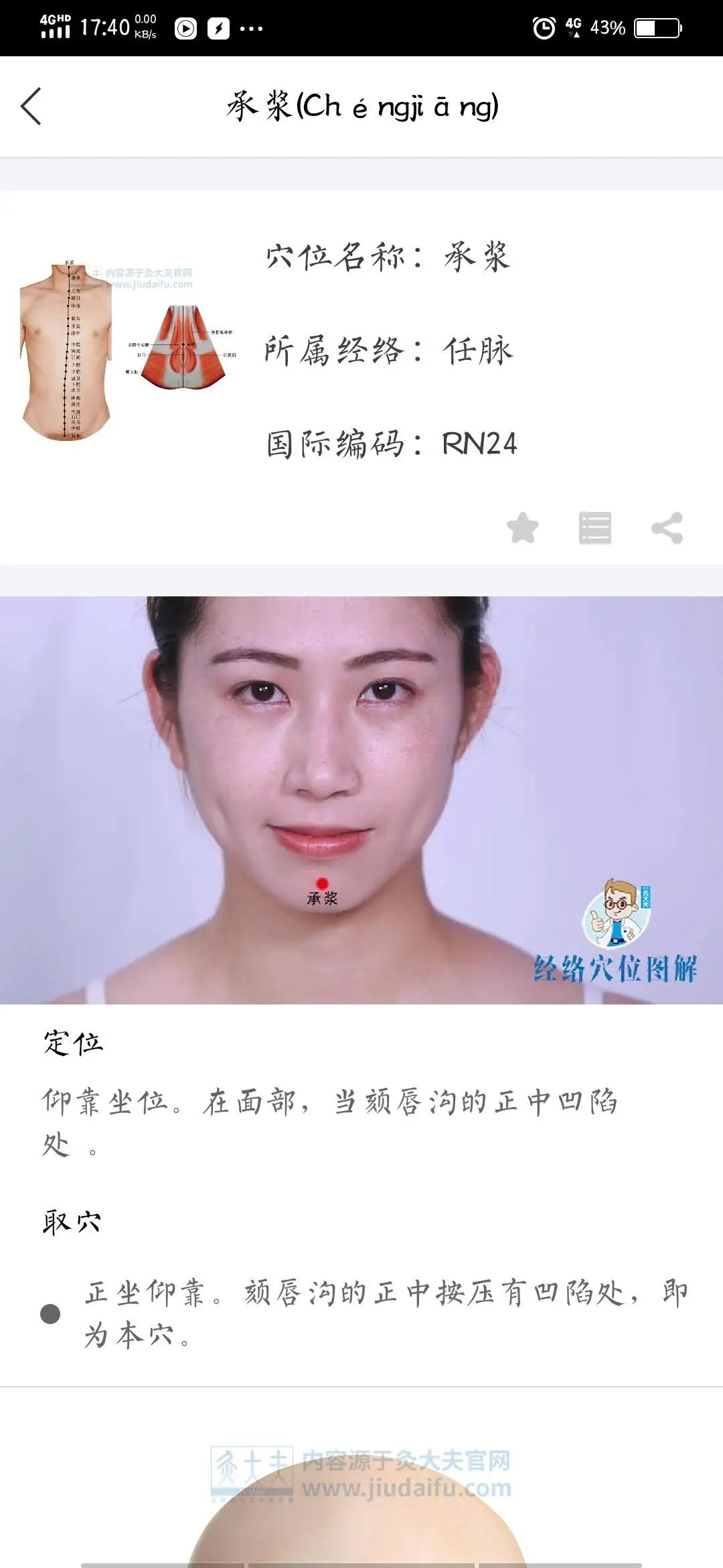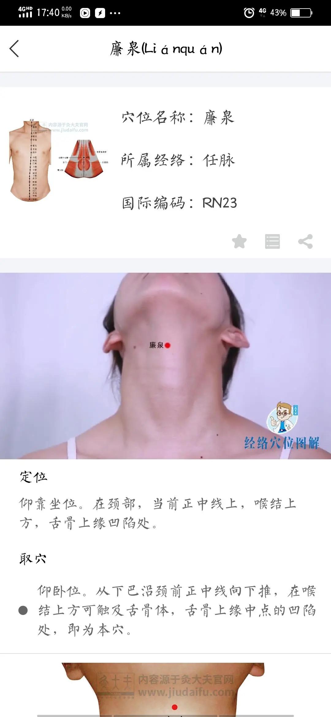 6、右手放于下颌部,拇指指腹、食指侧面同时按揉承浆穴,廉泉穴。