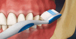 要将牙刷斜 45 度朝向牙龈,放在牙齿和牙龈交界处。