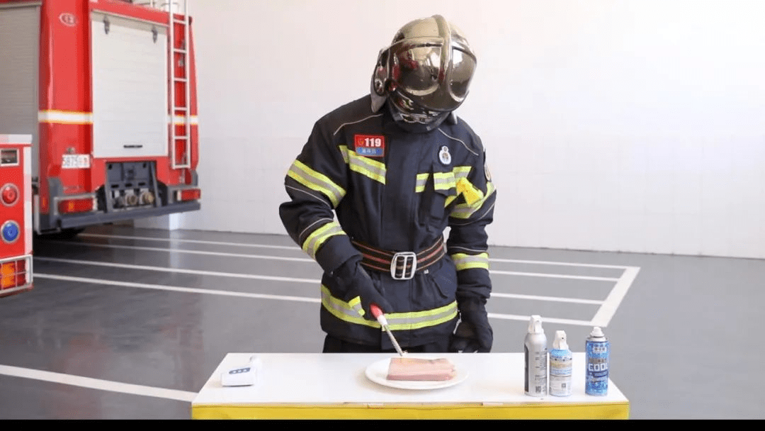 接着,消防指战员又将主打成分为乙醇的喷雾喷到装有猪肉的盘中,当遇到明火后,猪肉表面也迅速燃烧起来。