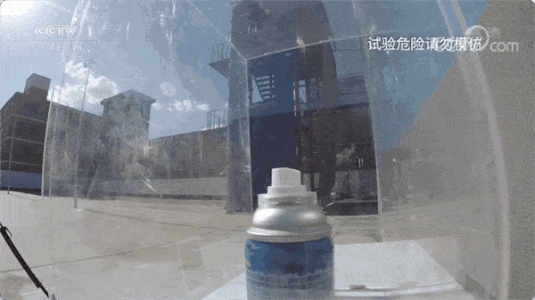 消防指战员模拟了一个类似车厢的密闭空间,将降温喷雾和测温仪一同放于其中,在阳光下进行暴晒,观察喷雾剂瓶身的变化。当实验空间内温度超过58℃时,测温仪已经无法正常工作,而降温喷雾的瓶身开始急剧膨胀,瓶盖被猛地弹出,喷雾剂罐也倒了。
