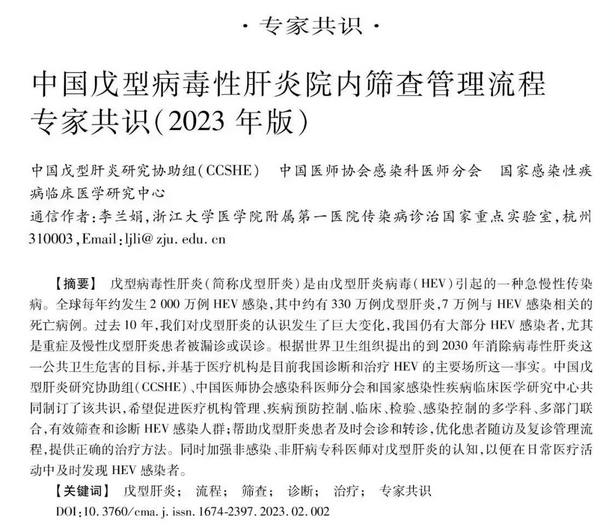 2023年由李兰娟院士牵头,中国戊型肝炎研究协助组联合中国医师协会感染科医师分会与国家感染性疾病临床医学研究中心共同发表了《中国戊型病毒性肝炎院内筛查管理流程专家共识》,距离上一版中国医师协会感染科医师分会出的《戊型病毒性肝炎诊疗规范》的发布时间已相隔超过了13年。