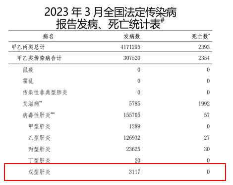 放眼全球来看,戊肝的高发地区位于南非和亚洲地区,尤其在中国中东部地区的临海城市防控形势仍然不容乐观,2023年3月国家发布的全国法定传染病报告中显示,平均每月疾控部门报告的发病人数已大于3100例,相较甲肝的1300例而言,已经超过了其两倍有余,同时因为戊肝的知晓率相对较低,对于确有数据来说戊肝发病数可能更高,出现漏检的概率也非常大。这很大程度上说明了目前戊肝对我国的危害风险指数也在逐年递增,为此国家院士积极面对戊肝可能爆发的危险,紧急出台相关防控措施。