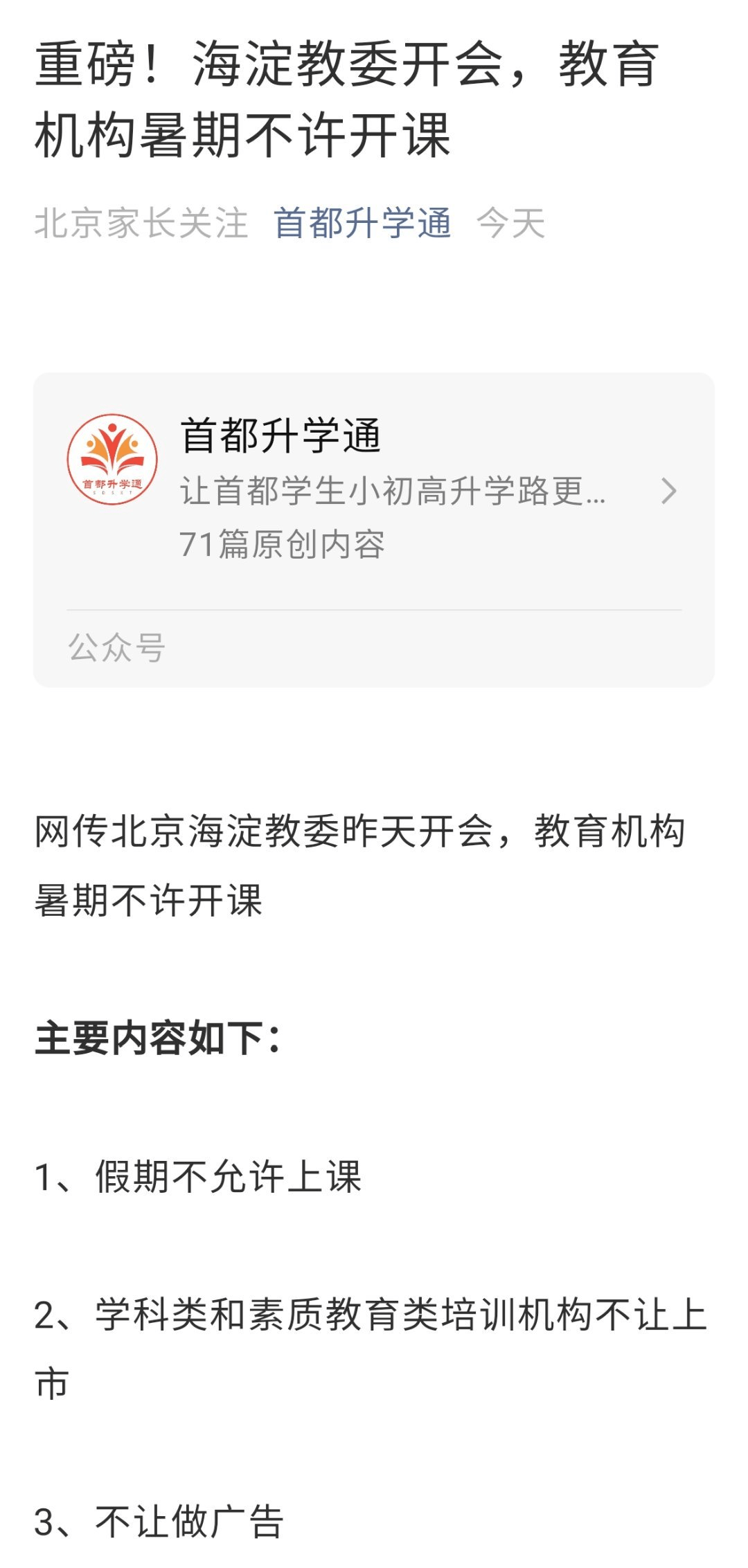 24日,北京一家教育类自媒体发布消息称,北京海淀教委开会,要求培训机构暑期不允许开课,学科类和素质类教育培训机构不得上市,教育培训机构不得做任何广告。