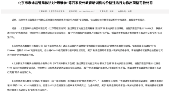 今年4月25日,北京市场监管局官网通报,因价格违法、虚假宣传等行为, 学而思 、高途课堂、 新东方在线 、高思四家校外教育培训机构,被顶格罚款50万元。