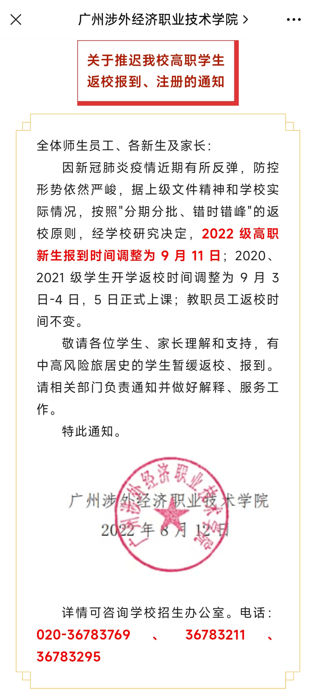 敬请各位学生、家长理解和支持,有中高风险旅居史的学生暂缓返校、报到。请相关部门负责通知并做好解释、服务工作。