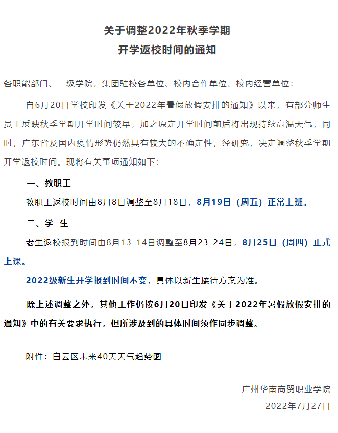 因新冠肺炎疫情近期有所反弹,防控形势依然严峻,据上级文件精神和学校实际情况,按照"分期分批、错时错峰"的返校原则,经学校研究决定,2022 级高职新生报到时间调整为 9 月 11 日;2020、2021 级学生开学返校时间调整为 9 月 3 日-4 日,5 日正式上课 ;教职员工返校时间不变。