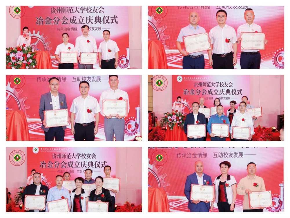 贵州师范大学校长张绍东教授为冶金分会授牌,首任会长张皓先生郑重接牌。现场,张绍东向会长张皓颁发聘书;贵州师范大学副校长张道伟向名誉会长王波、李靖、石华武,执行会长吴翼、杜杰、程棡、秘书长陈志鹏、监事长袁富康颁发聘书;贵州师范大学校友会负责人孙克艳则向常务副会长、副会长等负责人颁发了聘书。