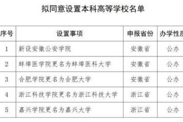 教育部:新设置5所高校! 11月20日,教育部发布《关于拟同意设置本科高等学校的公示》,拟同意设置5所高校,其中包含4所更名(安徽、浙江各2所)、1所新…… 所属分类:科技·教育 2023年11月21日