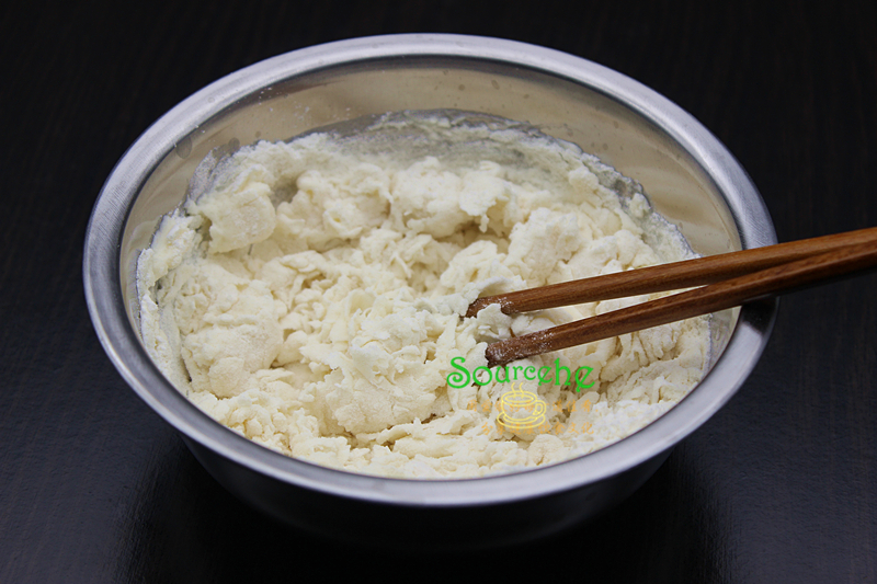 中筋面粉加入适量的水,搅拌均匀,面粉与水的比例为1:0.55,搅拌的时候有片状,说明水的比例刚刚好。然后揉搓光滑的面团,静放10分钟,叫醒面。