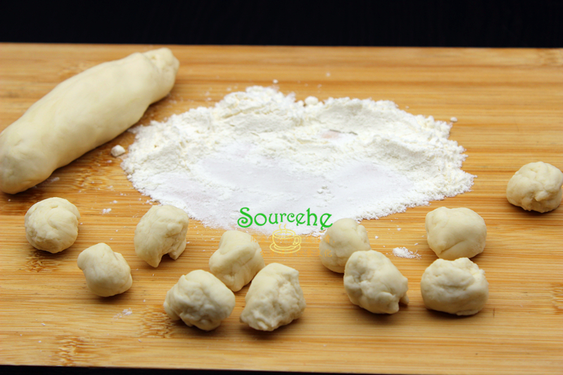 醒好的面,分成15克左右的小团,这个时候的小面团柔韧光滑,不沾手,不腻砧板。