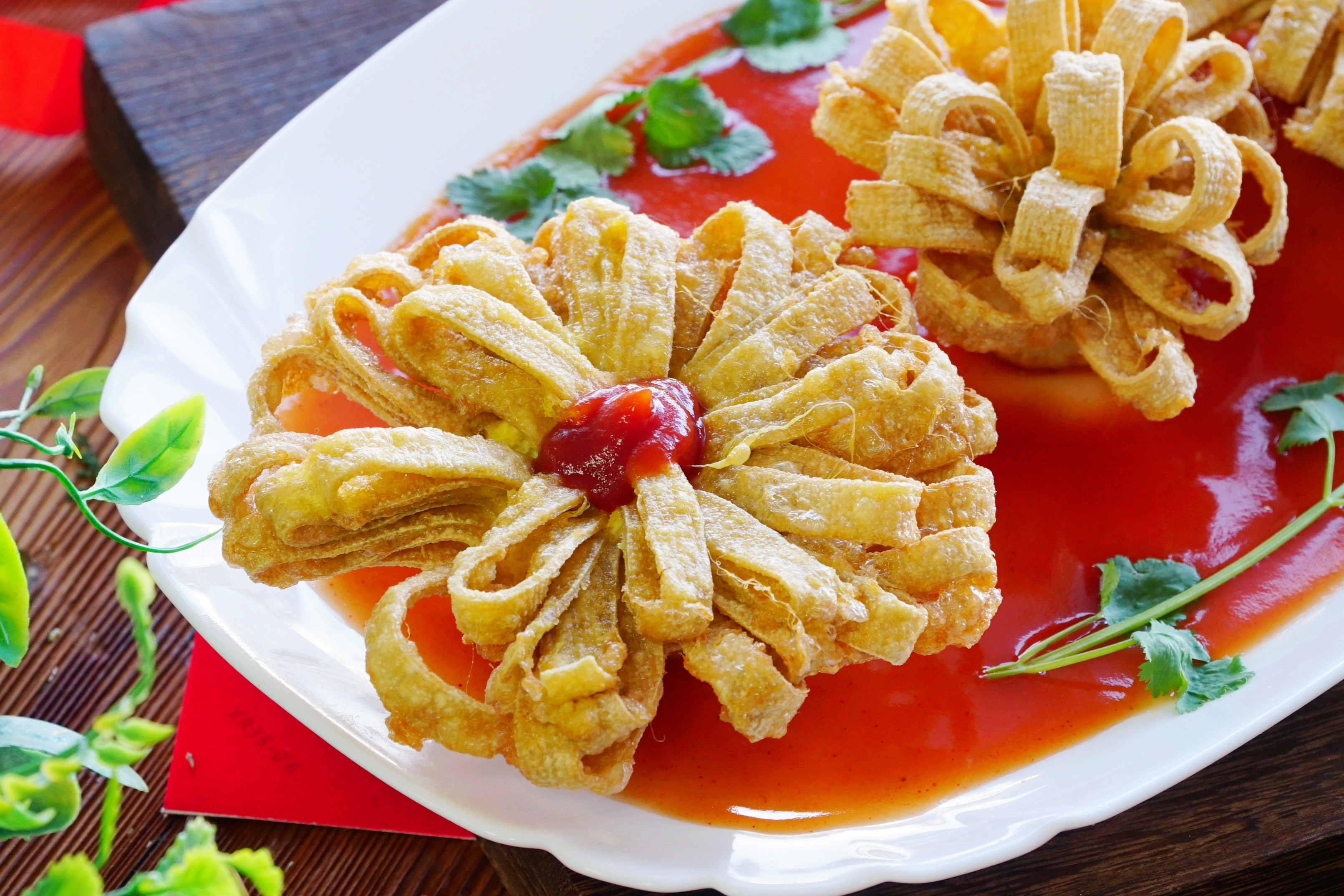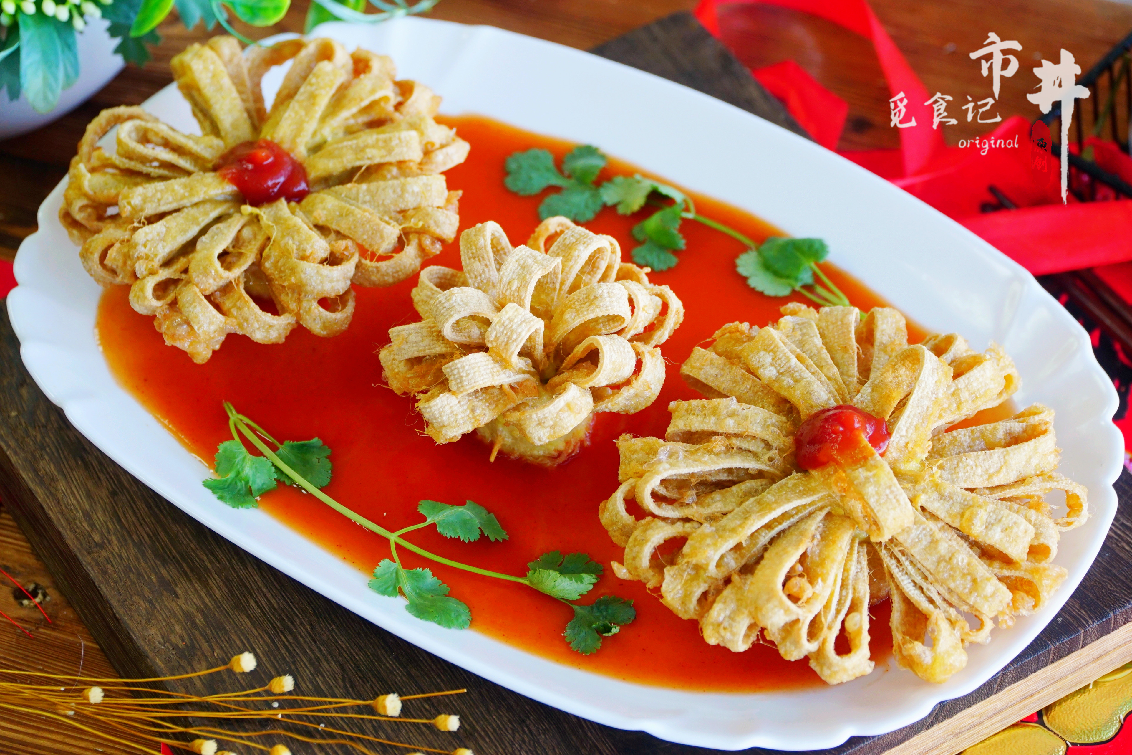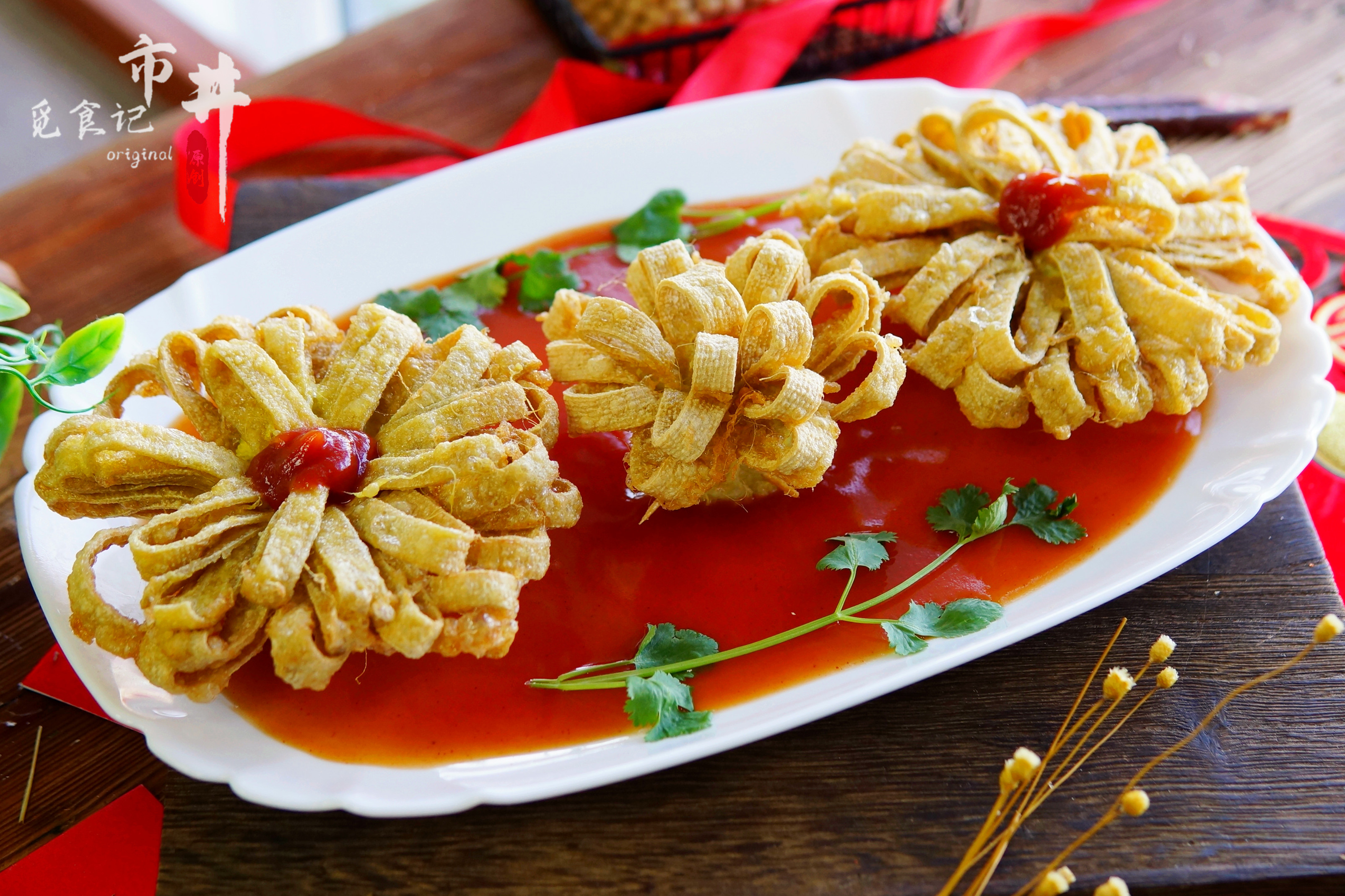 这是36道年夜饭菜品的第20道【锦上添花】。这道菜做出了鲜花的造型,如果不喜欢油炸的口感,可以简单蒸一下让其变得松软筋道,味道也是不错的,浇上茄汁后,口感酸酸甜甜不油腻,孩子们也特别喜欢吃。新春佳节,一道“锦上添花”端上桌,祝家人朋友的事业春意盎然,生活锦上添花。