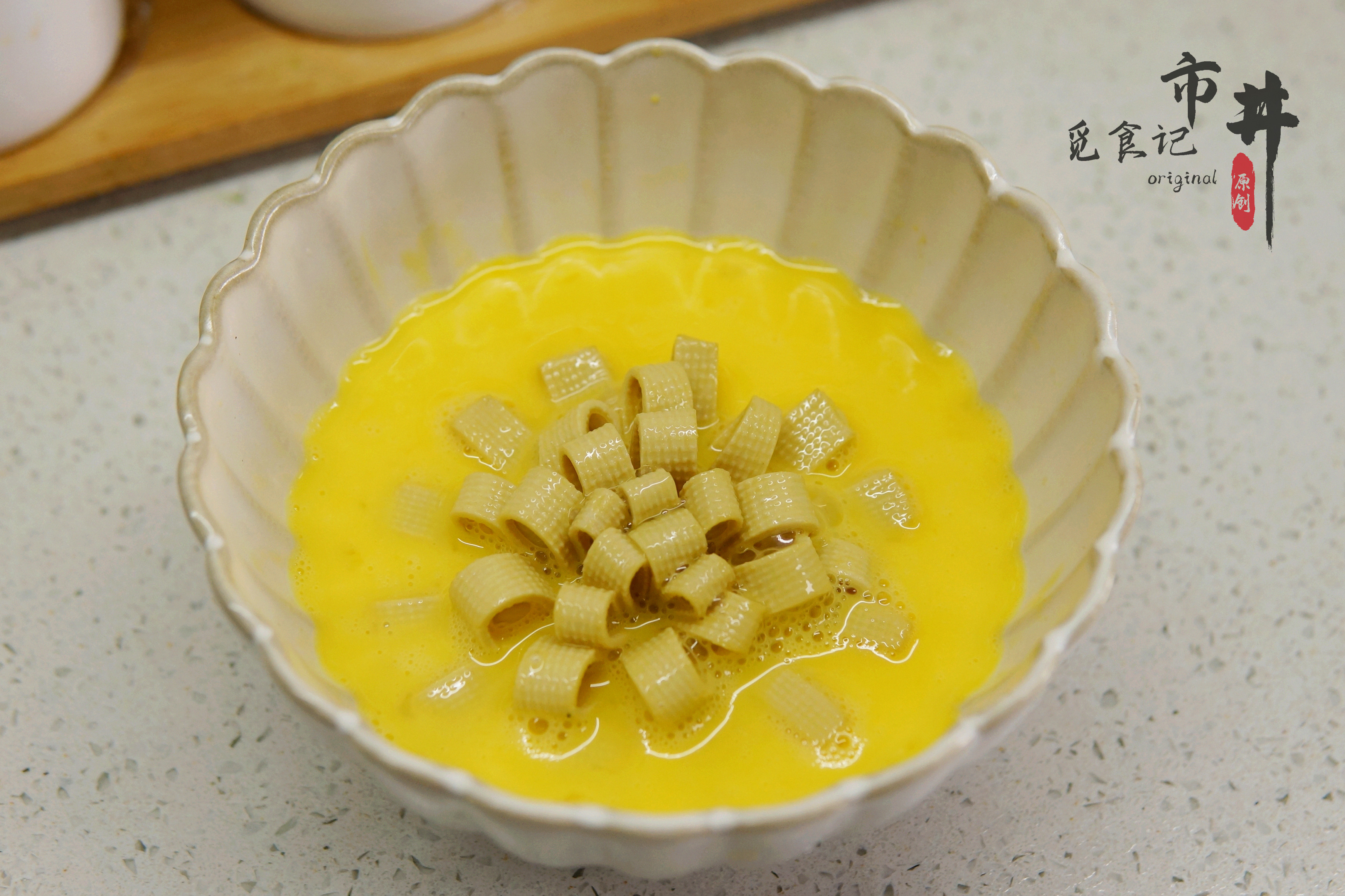 3、鸡蛋打入碗中,搅拌均匀,将千张放入蛋液中,使千张均匀地裹上蛋液,千张味淡,裹上蛋液可以丰富其味道,口感更好。