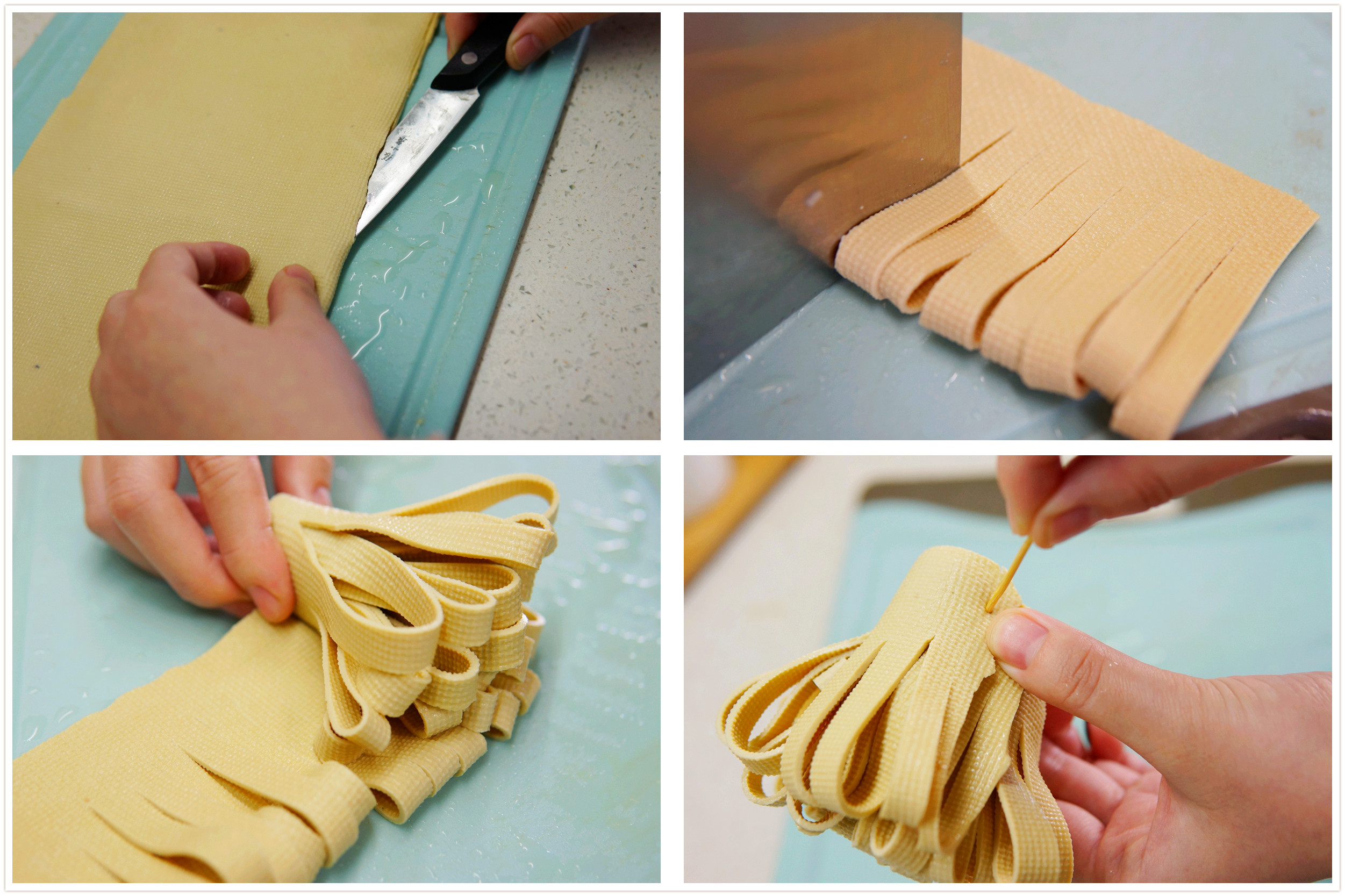 2、将千张对半切成两片后,对折改刀切成长条状,注意另一端不要切断,切好后从右至左卷起来,用牙签固定。