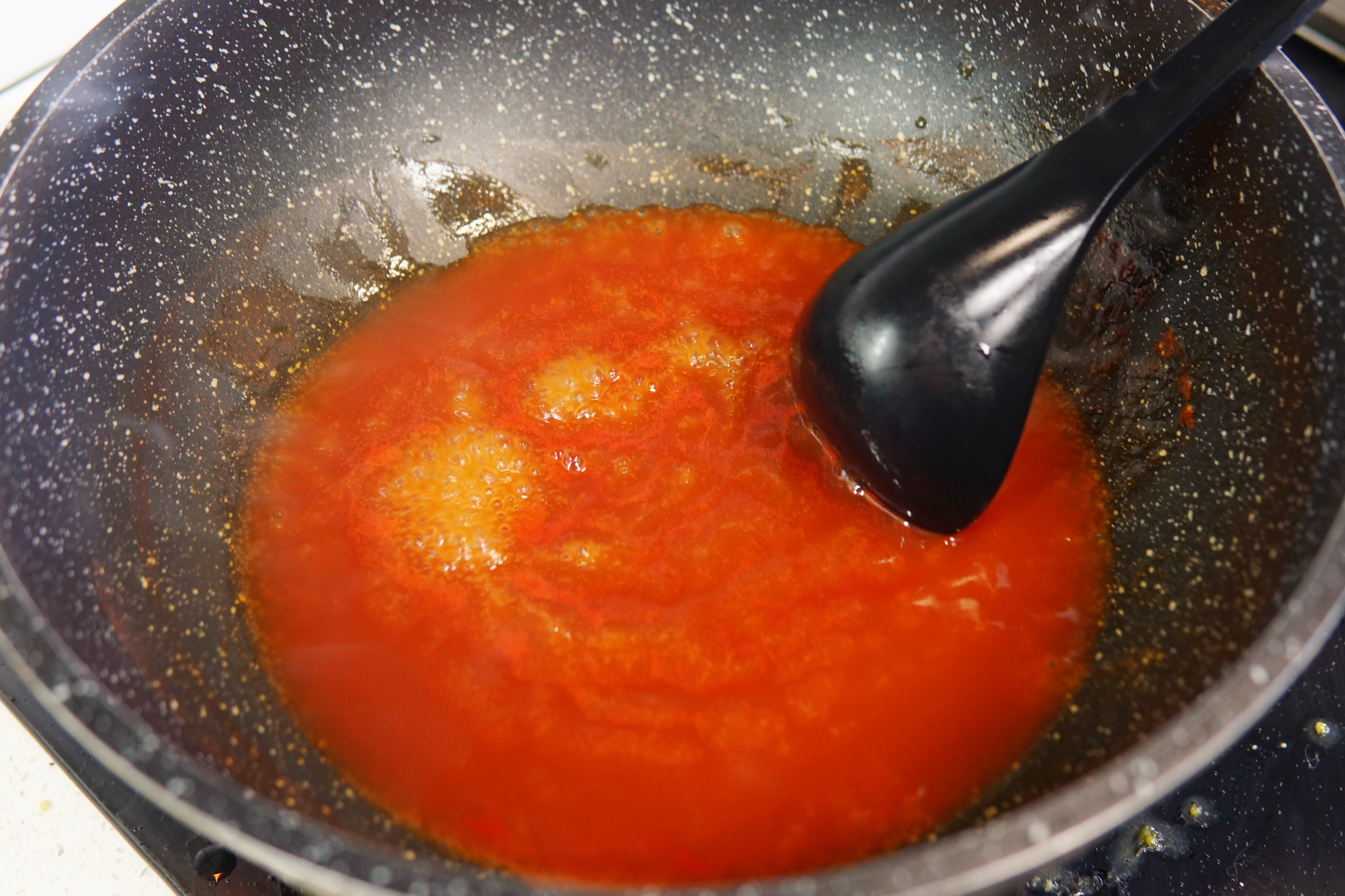 5、炒锅中加入3勺番茄酱、1勺白醋、1勺白糖和适量清水,小火慢熬至浓稠,按照自己的喜好,淋入盘中打底或浇到千张上,整理造型即可,一盘色味俱佳的“锦上添花”就完成了。
