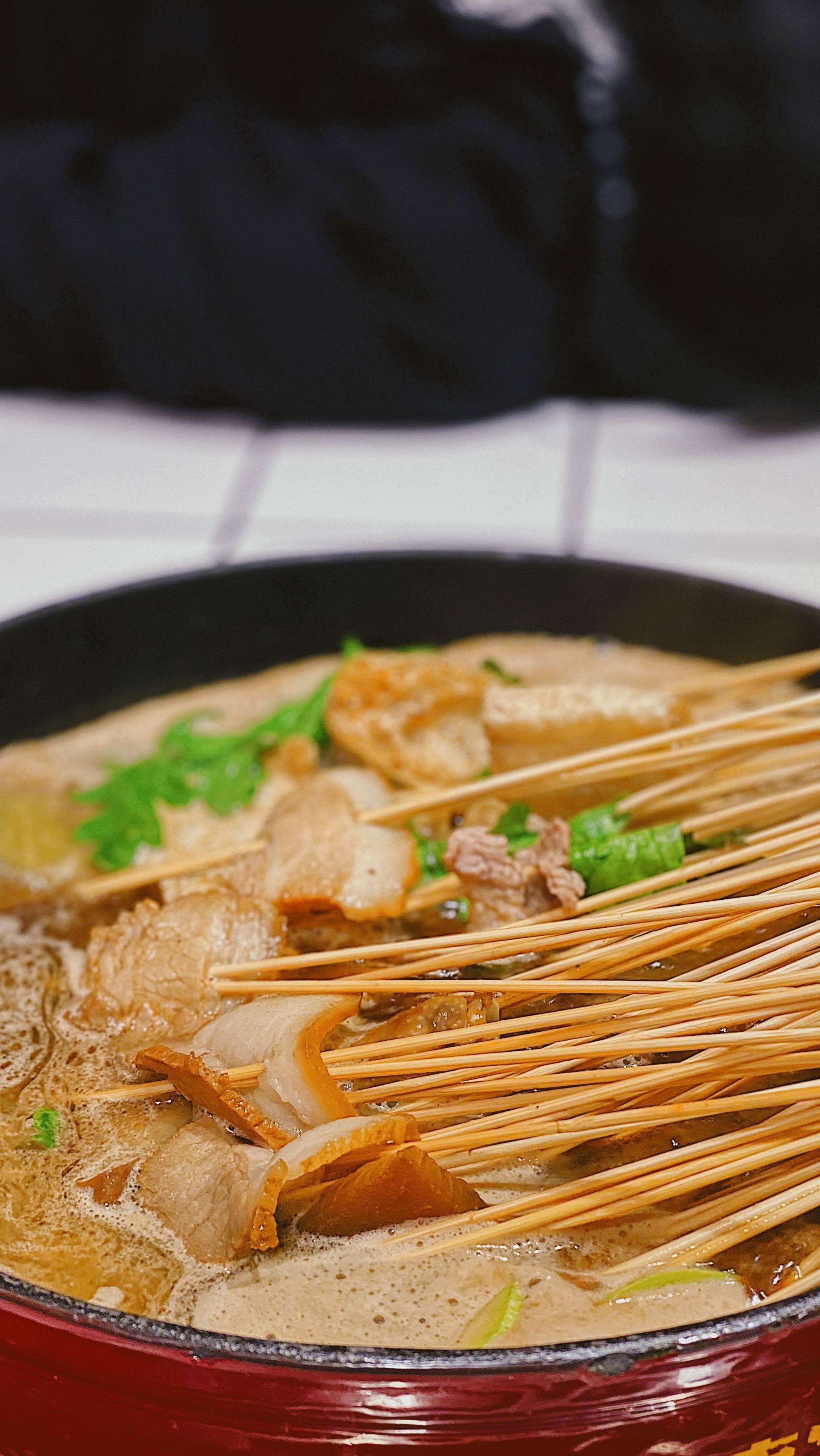 偏题了,狼外婆卤锅串串从名字可以想到它的锅底就是我们贵州的传统卤水,其实在疫情之前它们的卤水是循环使用的,所以才会将配菜以「串串」的形式呈现,因为卤水除了前期的调制,最佳的风味来源就是曾熬煮过的各种食物,所以少有的一些所谓数十年甚至百年的老卤店之所以好吃,并不是因为它们积攒了多么长时间的手艺,而是用来营业的那锅卤水煮过了多少东西。