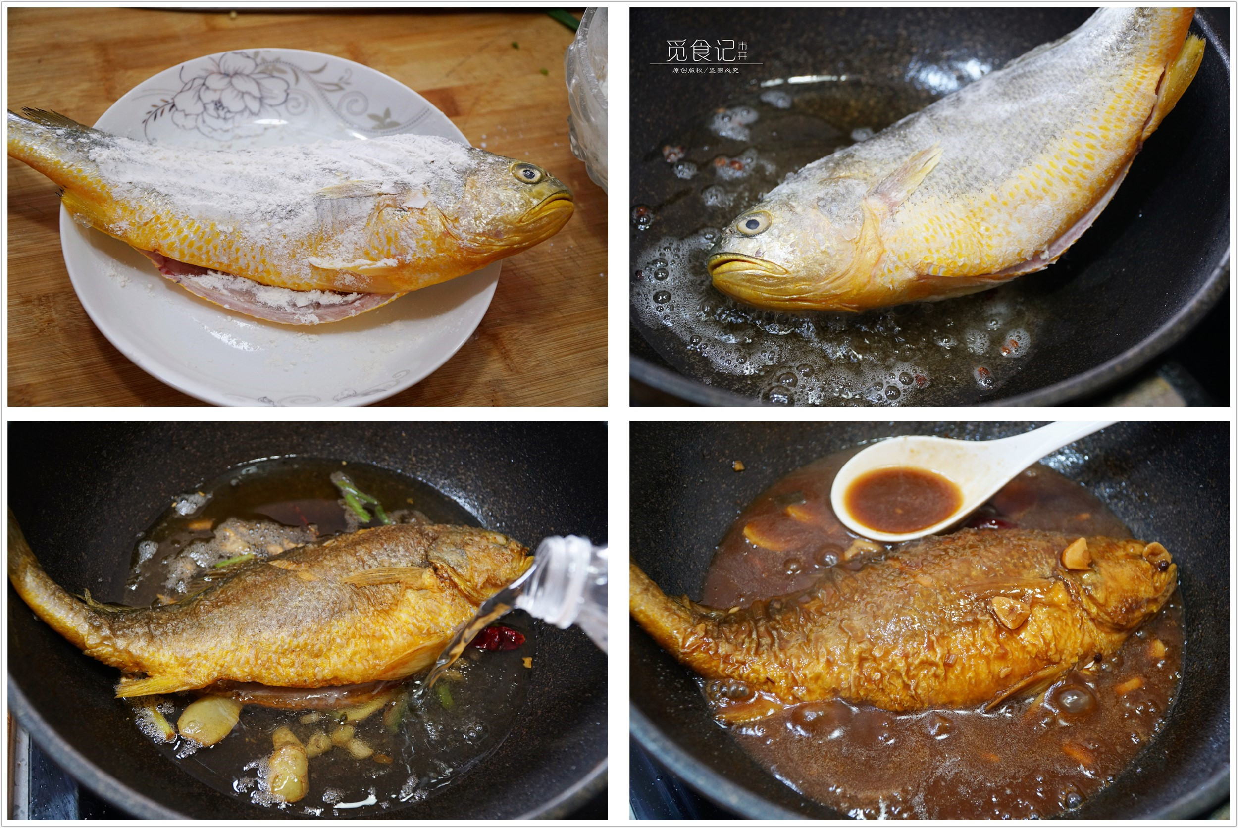 1、黄花鱼清洗干净,外层均匀地涂抹玉米淀粉,锅中油热放入黄花鱼煎至金黄。