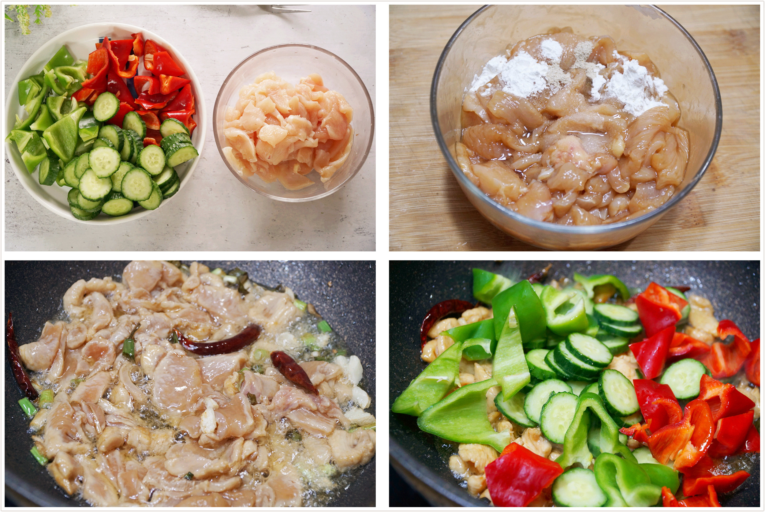 1、黄瓜切片,青红椒切块,鸡胸肉洗净切片,姜切丝,小葱切段。