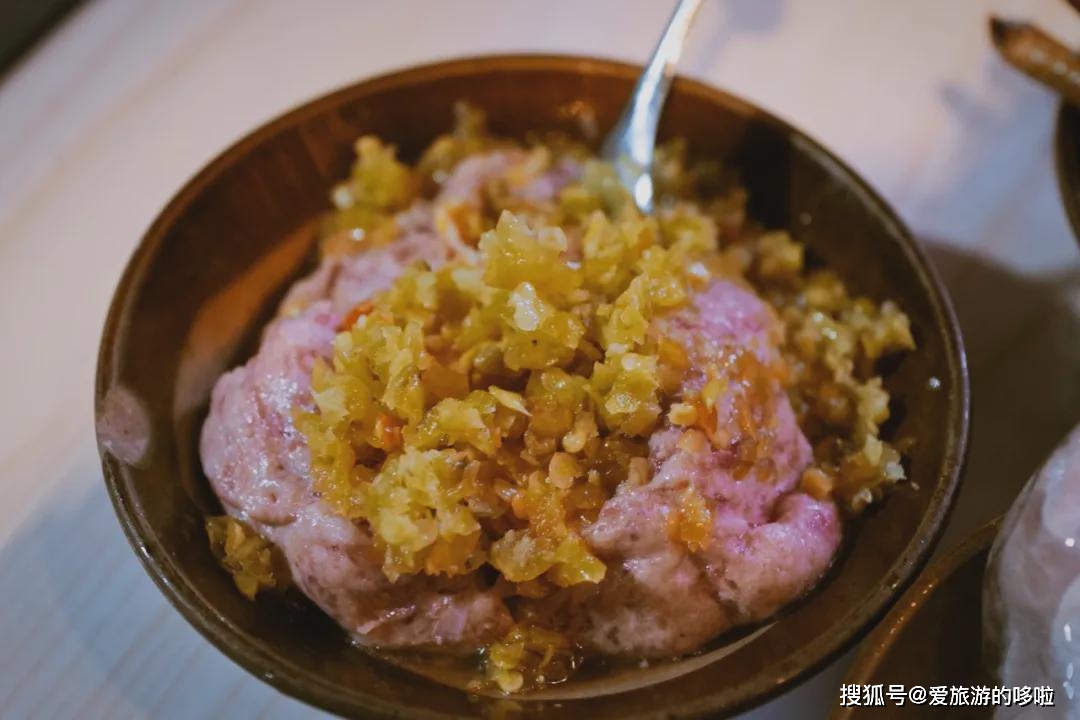 “圆子弹”系列里不乏一些奇奇怪怪的组合,比如折耳根和皮蛋的乱入。肉糜上来需要自己搅拌均匀,再用勺子挖出球形下锅(没有服务员过来硬要帮着操作可真好)。煮好的肉丸很有空气感,我点了山椒口味,越吃越香。