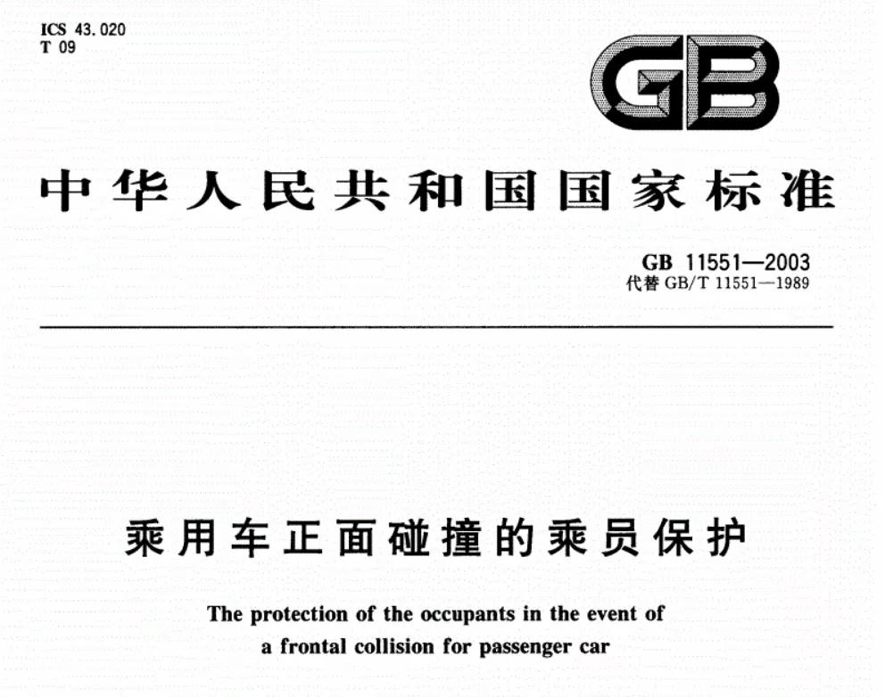我国由于汽车工业的发展较为缓慢,因此相配套的一系列标准也较迟发布。直到2004年,我国参照欧洲ECE R94法规制定的国家强制性标准GB 11551-2003《乘用车正面碰撞的乘员保护》才正式出台。