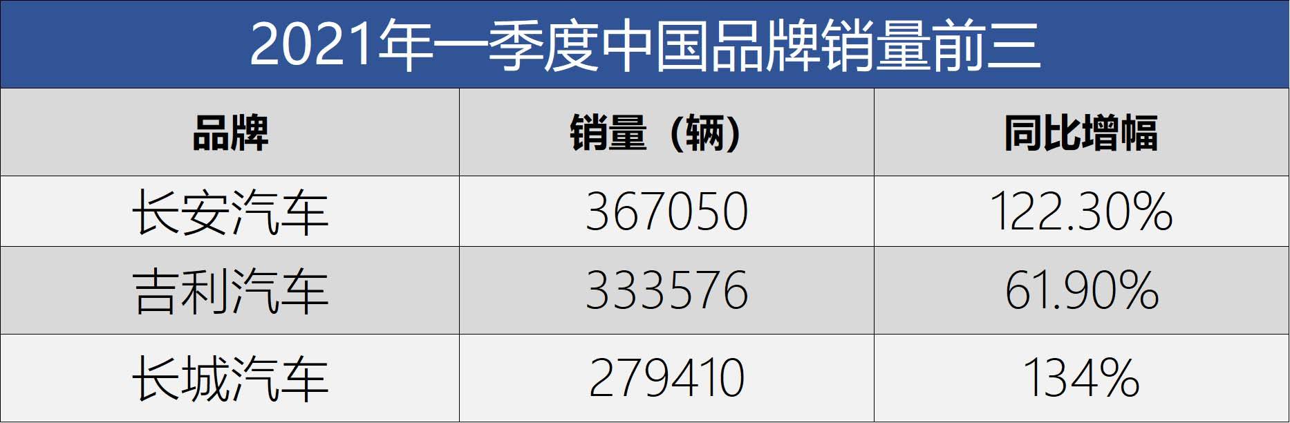 2021年一季度中国品牌的销量同比增长75.9%,达到了194.1万辆,这份成绩主要得益于头部传统车企和新势力车企旗下车型的畅销。在一季度,长安、吉利、长城都交出了不错的成绩,其中长安以36.7万辆的成绩位居中国品牌第一;而吉利和长城分别以33.35万辆和27.94万辆位居二三位。