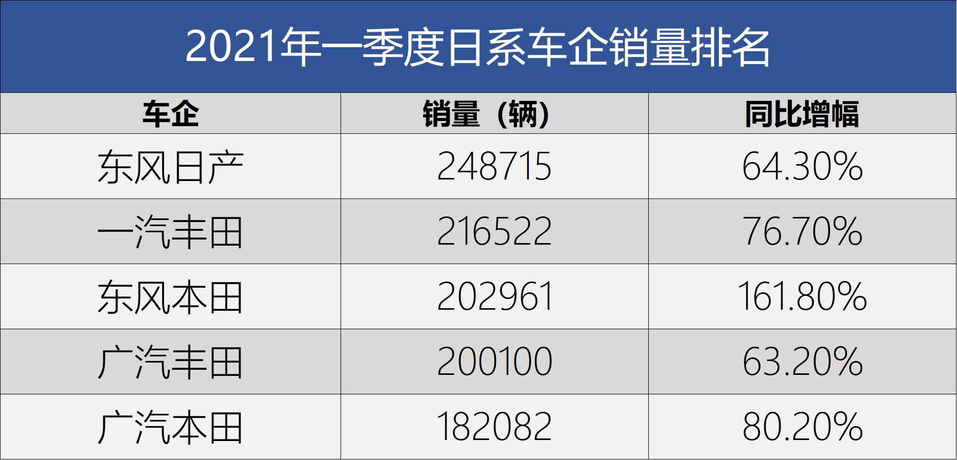 销量在德系之后的是日系车,尽管东风日产依旧是单一品牌冠军,不过在南北丰田和南北本田夹击之下,整体份额还是略显逊色。而丰田则是一季度的最大赢家,累计售出42.7万辆新车,其中一汽丰田有22万辆,广汽丰田则有20.7万辆。