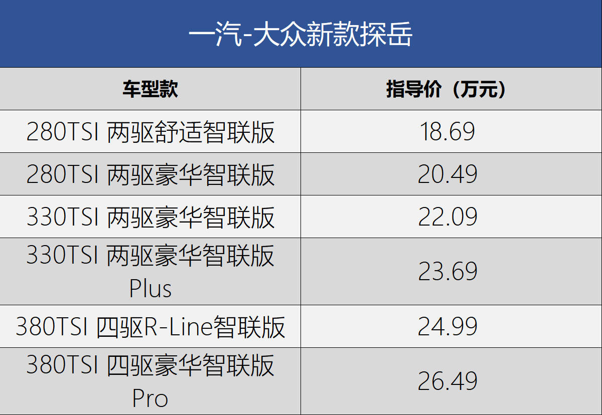官方指导价18.69-26.49万元 一汽-大众新款探岳上市