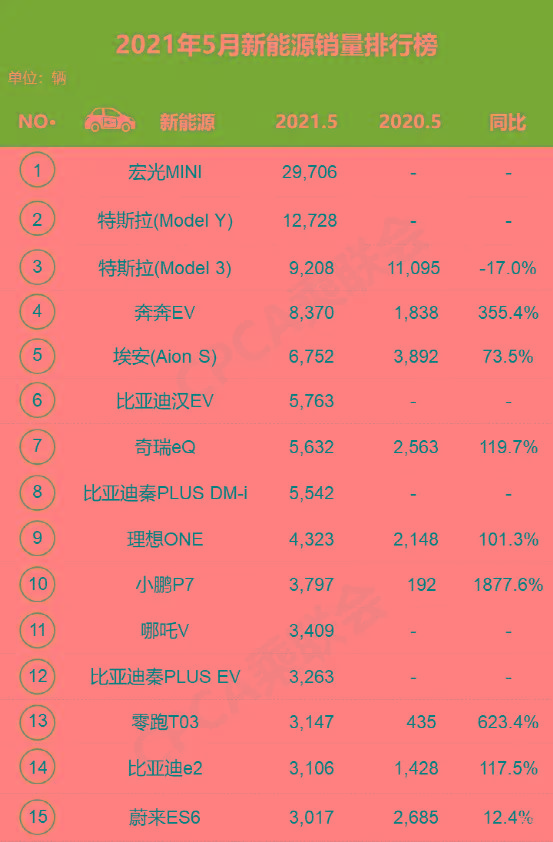 与此同时,特斯拉、P7、汉EV、蔚来ES6、宏光MINI EV、AION S销量都十分不错,都在前十五名榜单之内。