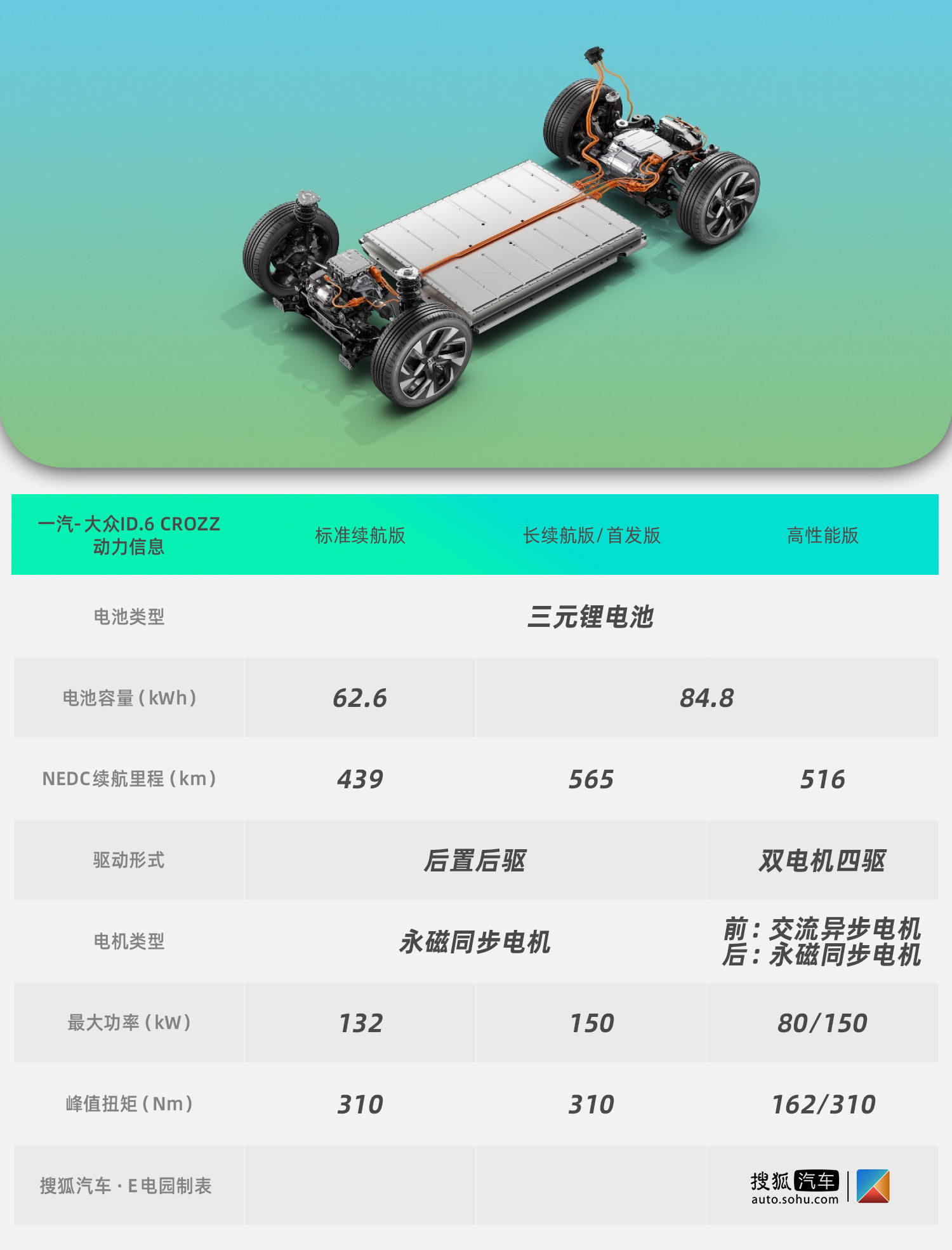 动力部分,新车将配备两种不同容量的三元锂电池组以及3个不同的动力版本,其NEDC续航里程在439-565km之间。不同版本的详细动力及续航参数可在下表中查看。