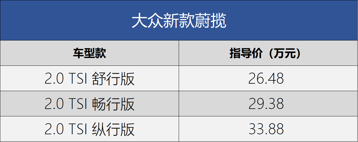 售26.48-33.88万 大众新款蔚揽正式上市 8月2日,大众进口汽车宣布新款蔚揽正式上市,新车将提供一种动力共计三款车型,售价区间为26.48-33.88万元。详细售价请见下表…… 所属分类:汽车资讯 2021年8月2日