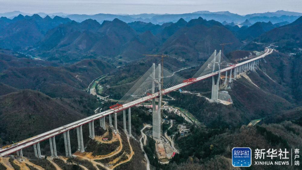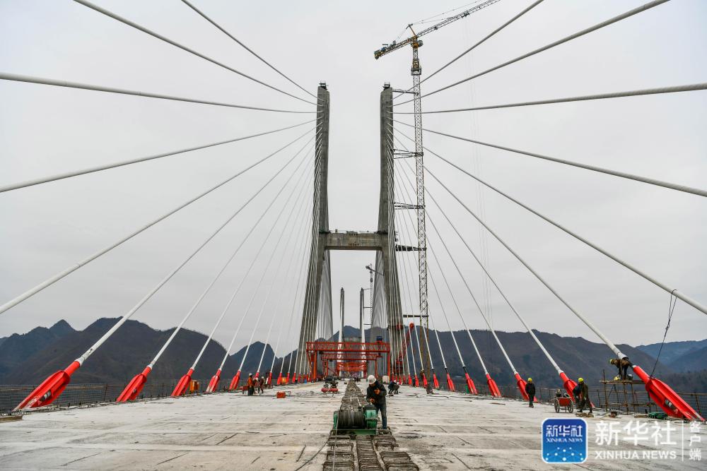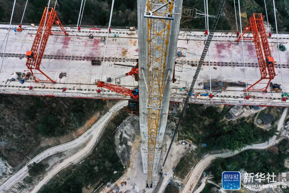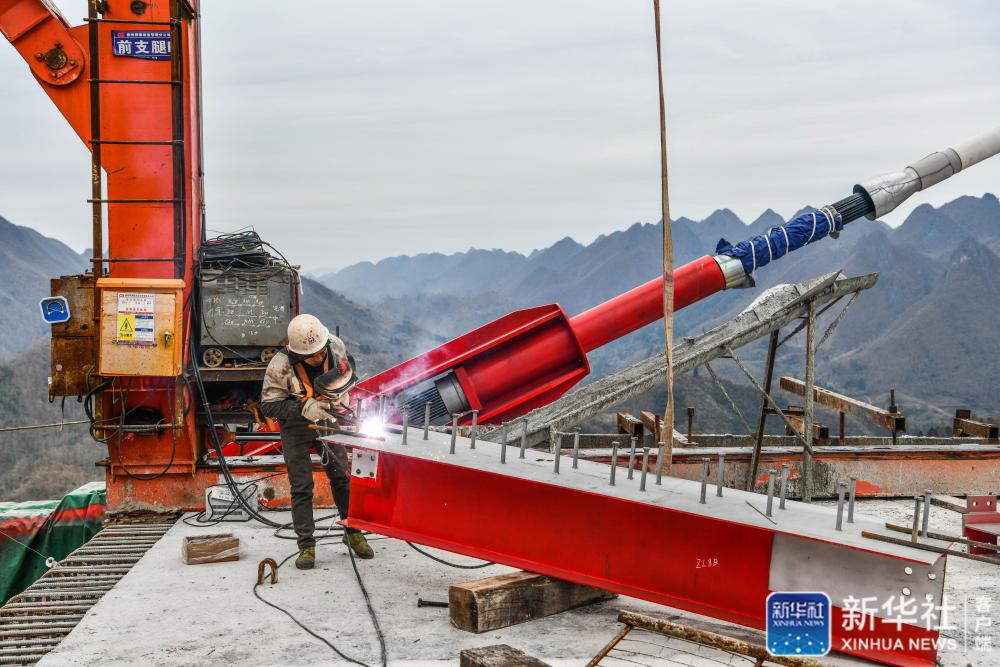1月10日,工人在贵州都安高速公路云雾大桥现场施工。新华社记者 杨文斌 摄