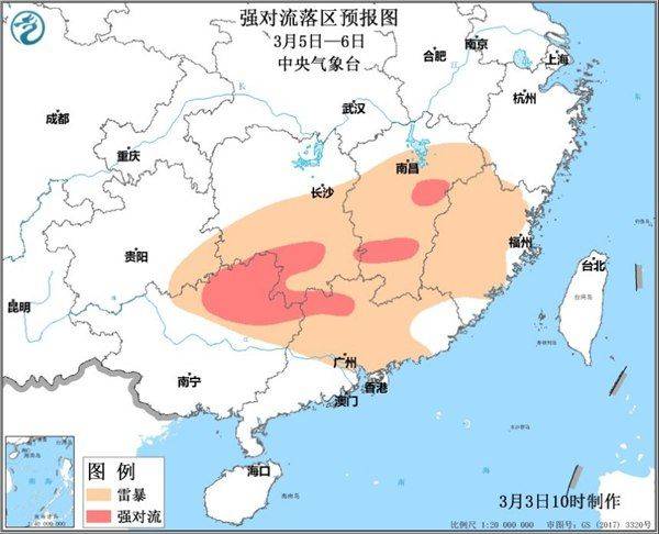 进入3月,南方地区冷暖气流交替频繁,降雨和强对流天气会逐渐增多增强。预计5日下午到6日,江西中部、湖南南部、广西北部及广东北部将出现短时强降雨,局地伴有8~9级雷暴大风天气,1小时最大降雨量20~50毫米。