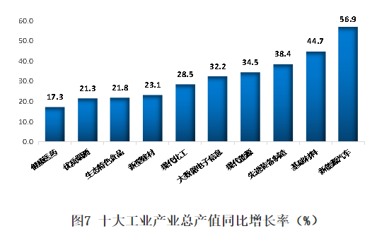 此外,从增长情况来看,2021年一季度,全省十大工业产业总产值比上年同期增长28.8%。其中,工业行业总产值增长29.9%,其他关联行业总产值增长22.6%。