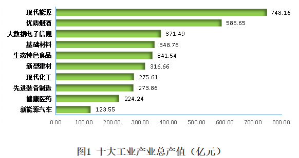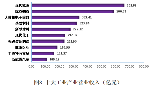 2021年一季度,十大工业产业营业收入分别是:现代能源实现营业收入659.69亿元、优质烟酒实现营业收入586.03亿元、大数据电子信息实现营业收入339.41亿元、基础材料实现营业收入323.04亿元、新型建材实现营业收入277.12亿元、现代化工实现营业收入237.37亿元、先进装备制造实现营业收入232.93亿元、健康医药实现营业收入183.99亿元、生态特色食品实现营业收入161.97亿元、新能源汽车实现营业收入109.19亿元。
