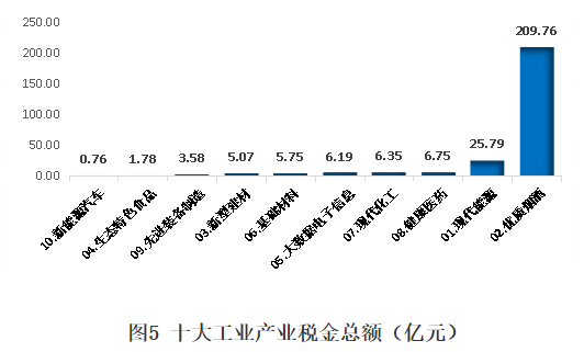 2021年一季度,十大工业产业上缴税金优质烟酒尤为明显,上缴税金209.76亿元,占十大工业产业税金总额的77.8%。另有现代能源、健康医药、现代化工、大数据电子信息、基础材料、新型建材、先进装备制造、生态特色食品、新能源汽车9个产业合计上缴税金62.03亿元,占十大工业产业税金总额的23.0%。