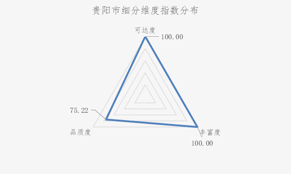 作为一座二线城市,贵阳生活圈活力指数仅次于深圳及上海,60个样本城市中居于头部位置。从统计结果看,贵阳排名较高主要原因是可达度及丰富度在60城中均居于首位,但在楼盘品质度方面跟其他头部城市相比仍有较大提升空间。从指标分布图可见,贵阳的均衡性并不高,标准差约为11.68,如果在涉及到绿化率、容积率、车位配比及物业管理等方面有所改进,其生活圈活力指数势必会进一步提升。