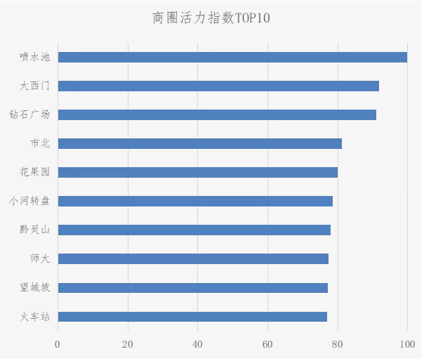 分商圈看,活力指数较高的商圈包括喷水池、大西门、钻石广场、市北及花果园等。排名较高的商圈表现出的共同特征是丰富度及可达度方面均比较靠前,楼盘品质度方面并不高,其中,喷水池在丰富度及可达度方面均居于首位。