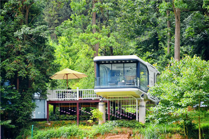民宿房房体下,是郁郁葱葱的各式蔬菜、中药材。房内,生活设施一应俱全,屋顶开设的全景天窗,可让居住此间的游客,在每个夜幕来领的晚上,仰望漫天繁星,静待流星在头顶划过,民宿房也因此得名“星空民宿”。