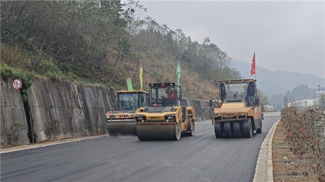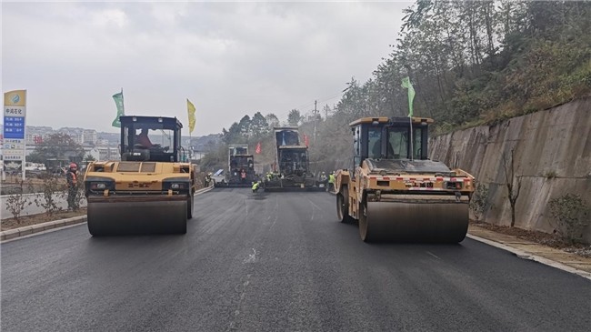 自项目启动以来,面对山区复杂地形、沿线复杂多变的地质环境、征地拆迁协调困难、雨季节长等诸多挑战。项目部科学组织、攻坚克难。在前期施工中,顺利完成了路基填筑、预制T梁架设、隧道开挖贯通及水稳层铺设等关键节点,成功处置了多处不良地质路段;本次面层摊铺全长约21公里,项目部提前筹划,精心组织,制定了详细的施工方案。并围绕沥青配合比、施工工艺、技术方案、设备投入、质量安全控制等方面对现场技术人员和施工队伍进行了详细安全培训和技术交底,将各环节责任落实到人。在摊铺过程中,全过程把控“人、机、料、法、环”关键环节。全程对沥青温度、摊铺厚度、碾压遍数与轨迹进行实时监测与反馈,确保路面平整度及各项指标均满足设计要求。