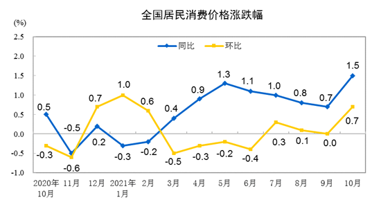 据国家统计局官网消息,2021年10月份全国CPI(居民消费价格指数)环比由上月持平转为上涨0.7%;同比上涨1.5%,涨幅比上月扩大……
