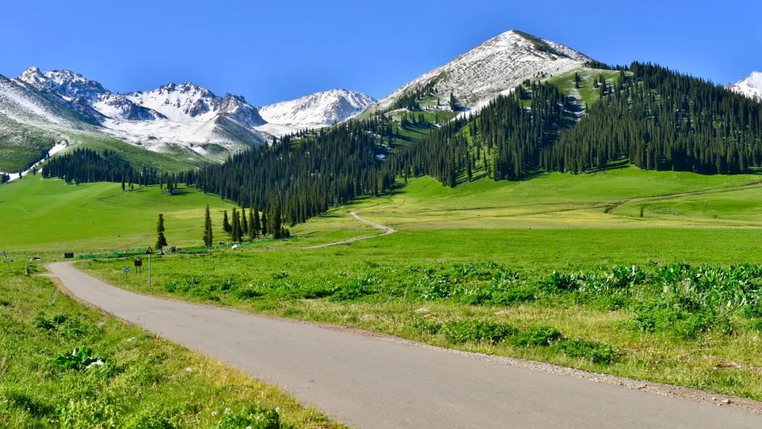 极目远望,洁白的雪山、连绵的山峦、翠绿的草地,组成了一幅绝美的画卷。