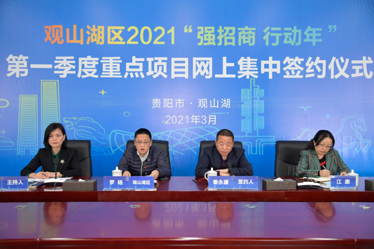 3月26日,观山湖区举行2021“强招商 行动年”第一季度重点项目网上集中签约仪式,现场签约项目涉及工业、交通、建筑、电商、大数据等行业。